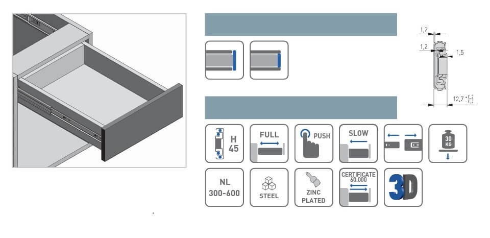 Greutatea sustinuta este 30 kg, inaltimea glisierei este 45 mm si grosimea 12.7 mm.