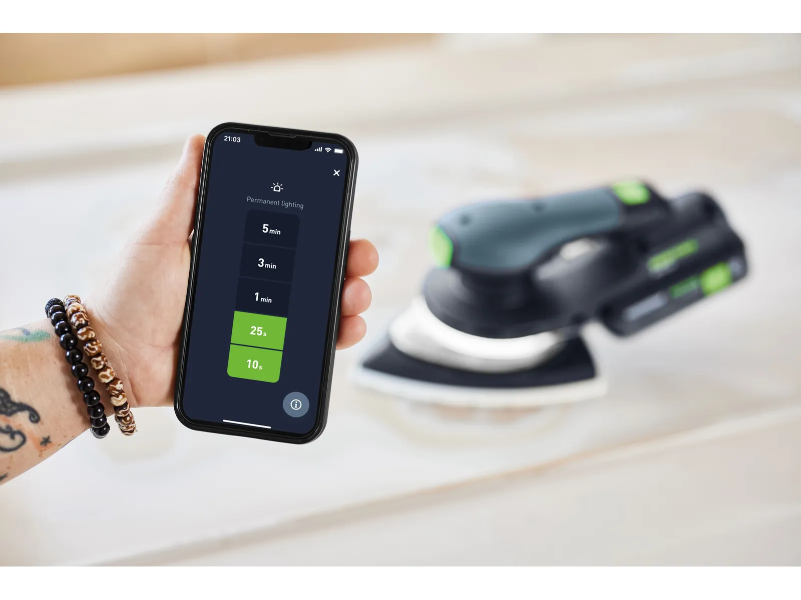 Mai multe funcţii cu aplicaţia Festool: Cu smartphone-ul dumneavoastră puteţi reduce lumina progresiv în mod individual şi puteţi regla durata de iluminare, astfel încât să puteţi verifica din nou suprafaţa după şlefuire